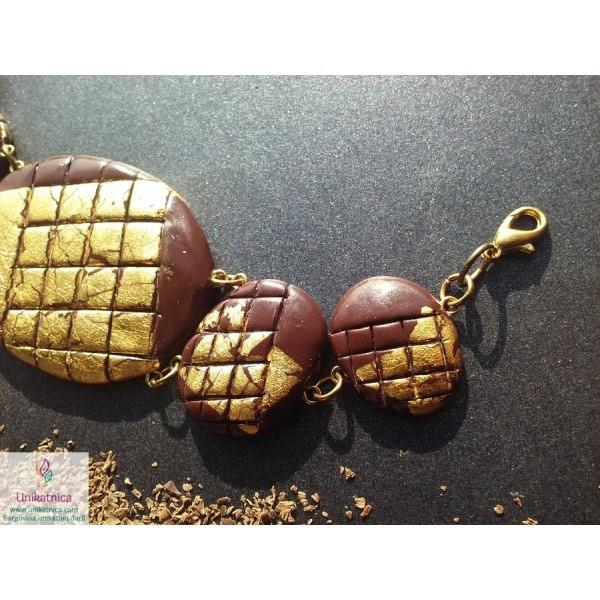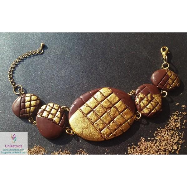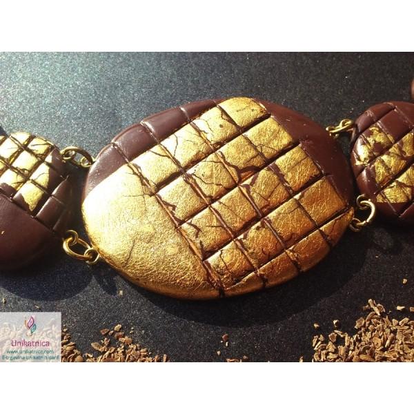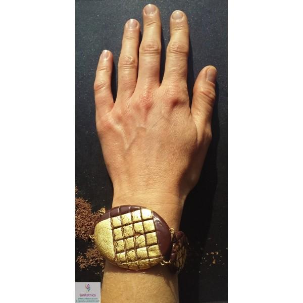Unikatna zapestnica z imenom Čutna poezija je čudovit in eleganten kos nakita iz kolekcije Čutna eleganca, ki spominja na koščke čokolade, ovite v zlat ovoj. Z zapestnico boste izrazili svojo eleganco in prefinjenost.