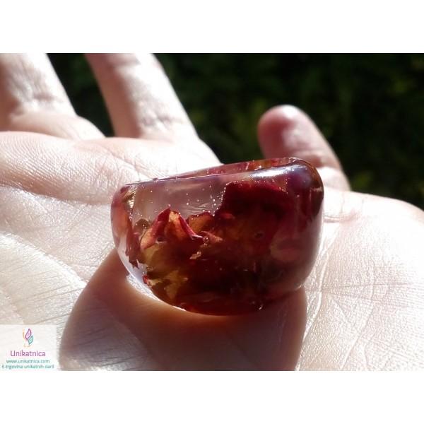 Ročno izdelan cvetlični prstan iz celega, s cvetnimi lističi rdeče vrtnice, je eleganten modni dodatek, ki si ga lahko nadanete ob najrazličnejših priložnostih.