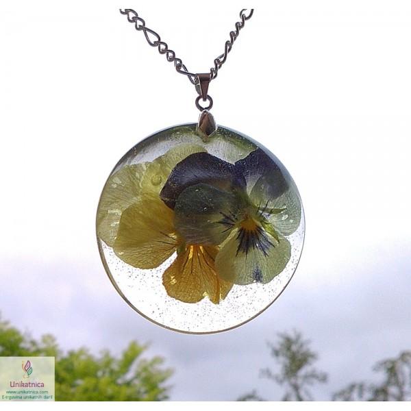 Ročno izdelana cvetlična ogrlica z vdelanima pravima cvetoma vrtne rumene terr temno modro rumene mačehe je eleganten in ženstven modni dodatek, ki si ga lahko nadanete ob najrazličnejših priložnostih.