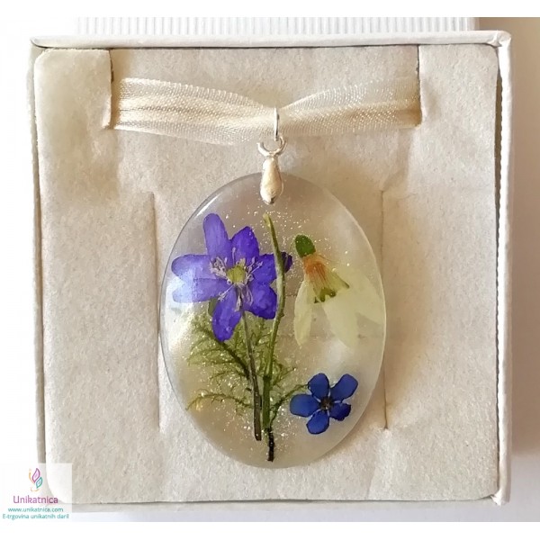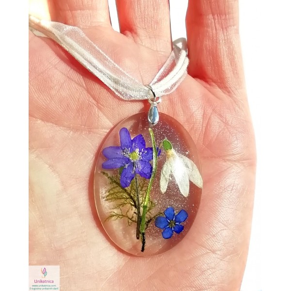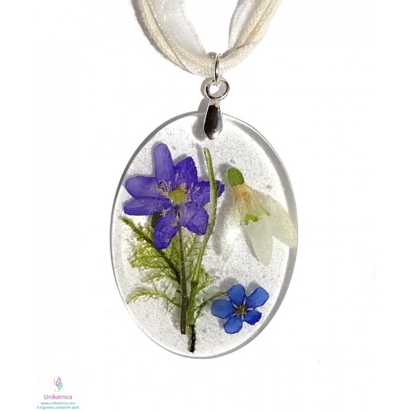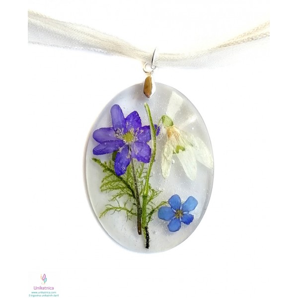 Ročno izdelana cvetlična ogrlica iz ročno nabranih cvetov pomladanske torilnice (gozdne spominčice), jetrnika, navadnega malega zvončka ter gozdnega maha, je eleganten in ženstven modni dodatek, ki si ga lahko nadanete ob najrazličnejših priložnostih.