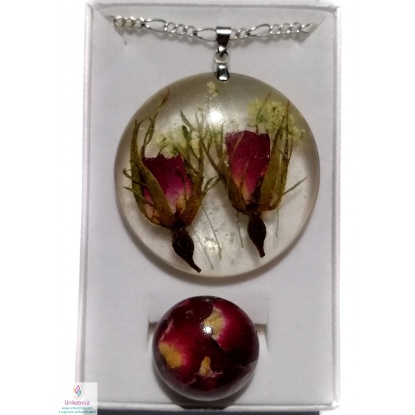 Ročno izdelana ogrlica in prstan s pravima popkoma in cvetnimi lističi divje vrtnice. Nakit spremlja opis s smboliko izbranega cvetja.