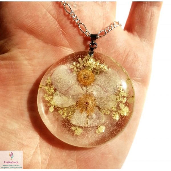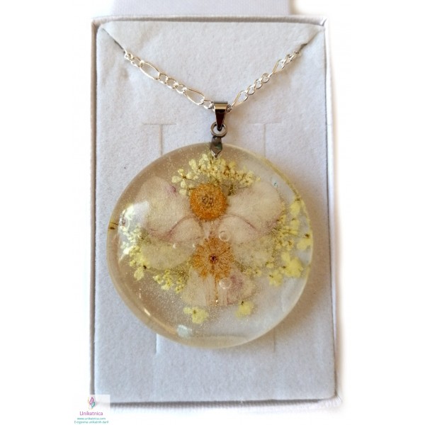 Unikatna, ročno izdelana cvetlična ogrlica, z vdelanimi pravimi cvetovi enoletne suholetnice (glavica in srce angela), domače orhideje (telo in krila angela) in zdravilnega gozdnega korena (ozadje ogrlice). Skupaj tvorijo motiv angela oz. vilinke, ki ima vzdolž telesca srebrno nitko.