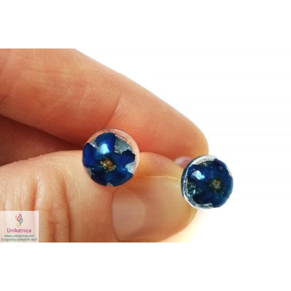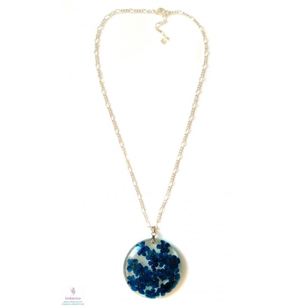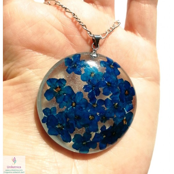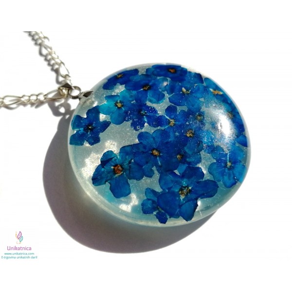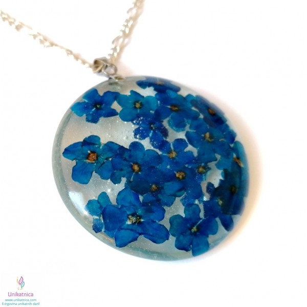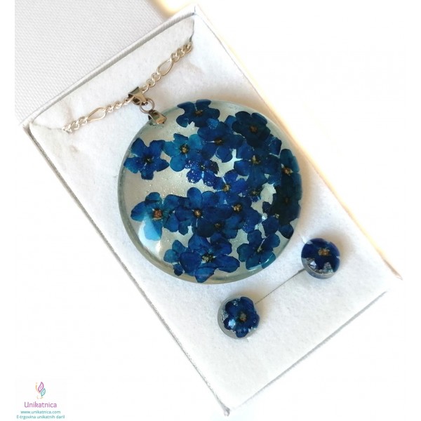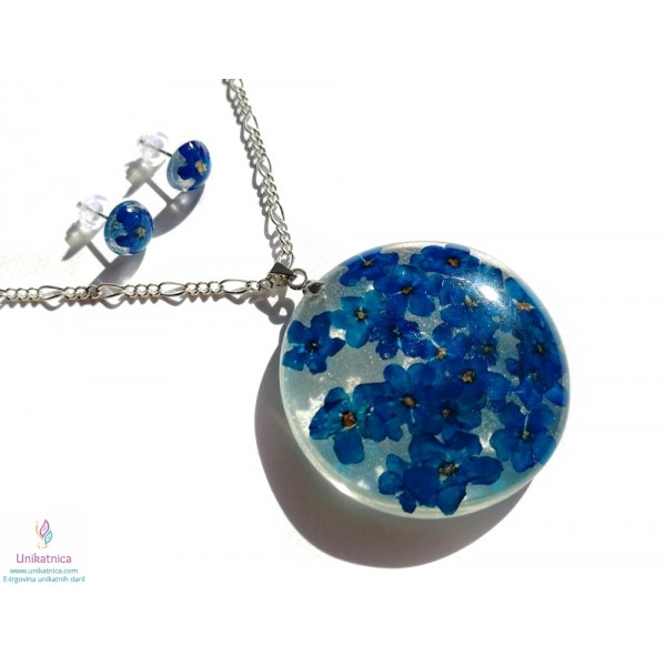 Ročno izdelana cvetlična ogrlica in DARILO (uhani) iz ročno nabranih cvetov gozdnih spominčic, je eleganten in ženstven modni dodatek. Simbolika spominčic: spominjanje, spomin na pretekle dogodke, ljudi, skromnost.