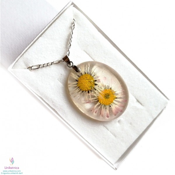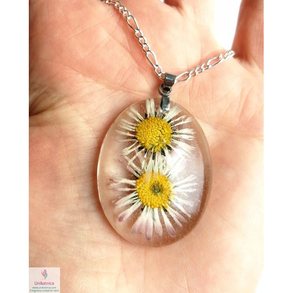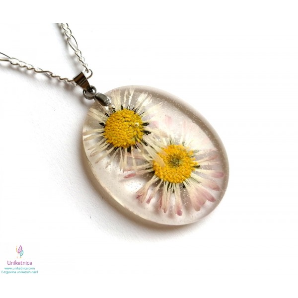 Ročno izdelana cvetlična ogrlica z vdelanima pravima cvetoma travniške marjetice, je eleganten in ženstven modni dodatek, ki si ga lahko nadanete ob najrazličnejših priložnostih.