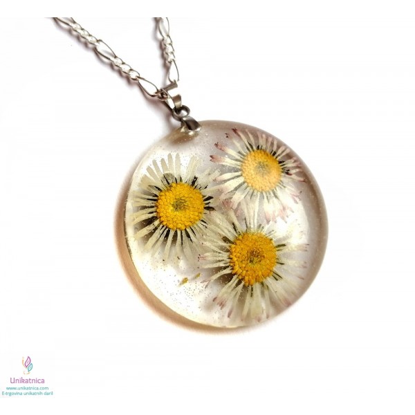Ročno izdelana cvetlična ogrlica z vdelanimi pravimi cvetovi travniške marjetice, je eleganten in ženstven modni dodatek, ki si ga lahko nadanete ob najrazličnejših priložnostih.