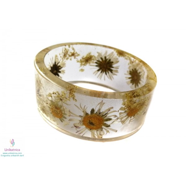 Ročno izdelana cvetlična zapestnica, v katero sem vdelala cvetove ter cvetne lističe marjeetice ter zdravilnega gozdnega korena, sta ličen in eleganten modni dodatek, ki si ga lahko nadanete ob najrazličnejših priložnostih.