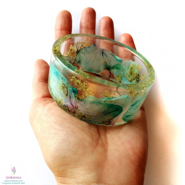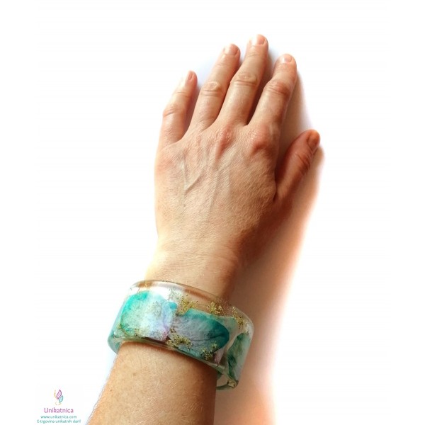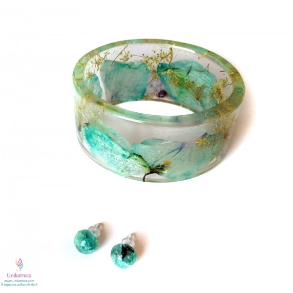 Ročno izdelana cvetlična zapestnica in darilo - uhani, v katere sem vdelala cvetove ter cvetne lističe turkizne orhideje in zdravilnega gozdnega korena, so ličen in eleganten modni dodatek, ki si ga lahko nadanete ob najrazličnejših priložnostih.