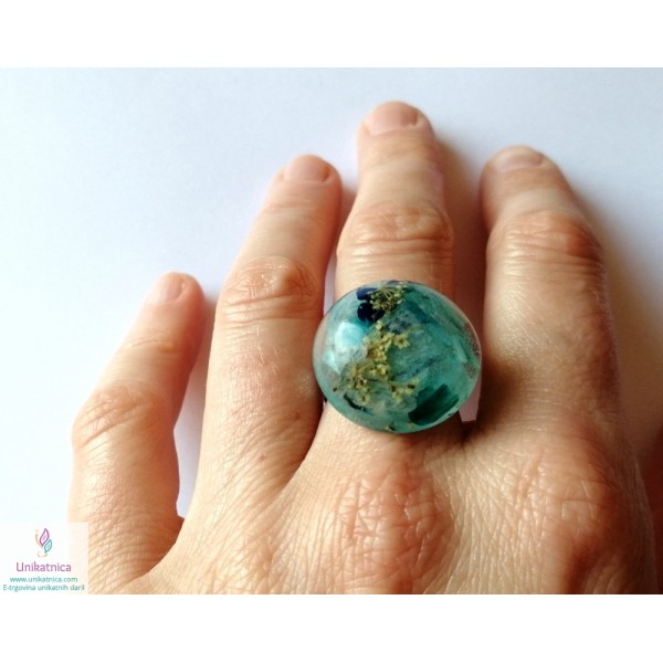 Ročno izdelan cvetlični prstan iz cvetnih lističev turkizne orhideje in cvetom gozdne spominčice. Simbolika spominčic: spominjanje, spomin na pretekle dogodke, ljudi, skromnost. Simbolika orhideje: obilje.
