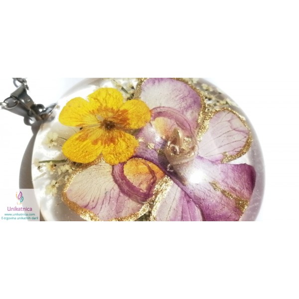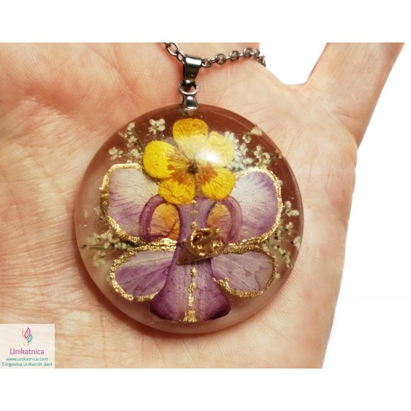 Cvetlični angeli in vile so kolekcija ročno izdelanega cvetličnega nakita, narejenega iz pravega cvetja (travniškega, gozdnega in vrtnega) in smole. Izdelala sem jih v obdobju največje polne lune v novembru, tako so prepojeni z energijo mogočne, ženstvene lune, ki napaja žensko s čutnostjo in ženstvenostjo, krati pa je cvetje prepojeno s sončniimi žarki, ki jim je med izdelavo vlivalo moči in življenje. Luna in Sonce imata močno simboliko, njuni energiji pa se pretakata tudi v tej cvetlični, angelsko vilinski ogrlici, v katero sem poleg zlatice, cvetnih lističev orhideje in zdravilnega gozdnega korena, dodala še drobno morsko školjko, ki jo v rokah drži angel, cvetni lističi orhideje so okrašeni z zlatitvenim prahom. Zlato je močan simbol obilja na vseh področjih, tudi orhideja, iz katere je narejen cveltični angel, predstavlja obilje. Kaj pripoveduje, sporoča cvetlični angel oz. vila? To bo izvedela ženska, ki bo nosila izbrano ogrlico. Cvetlična angelsko vilinska ogrlica je zapakirana v lični darilni škatlici, s priloženim lističem, na katerem je opisana simbolika cvetlične angelsko vilinske ogrlice. Takšna ogrlica je čudovito praznično darilo ob Božiču, Novem letu ali osebnem prazniku.