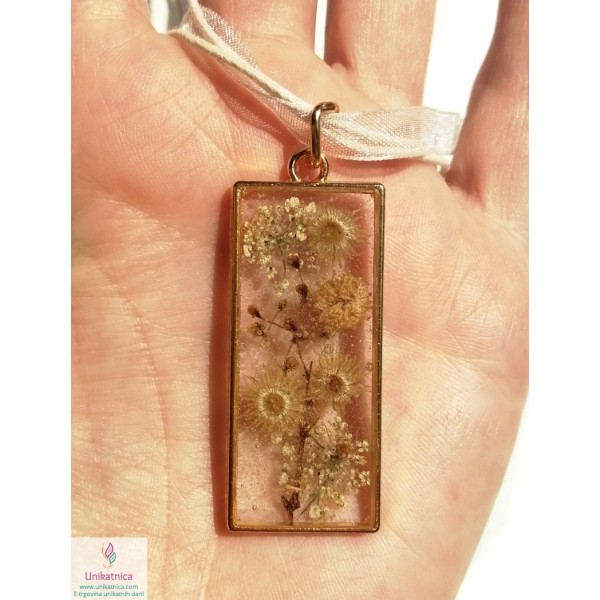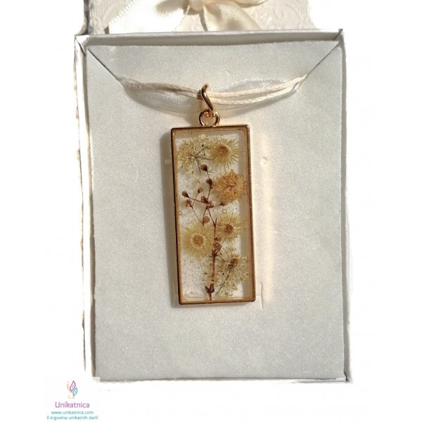 Ročno izdelana cvetlična ogrlica z vdelanimi pravimi cvetovi navadne travniške lakote in sredico enoletne suholetnice, je eleganten in ženstven modni dodatek, ki si ga lahko nadanete ob najrazličnejših priložnostih.