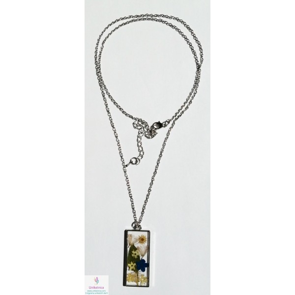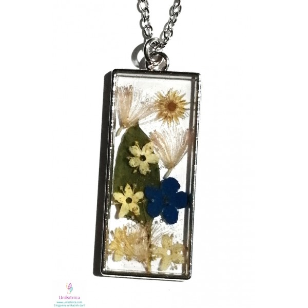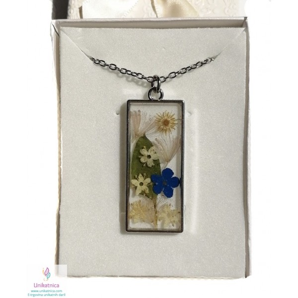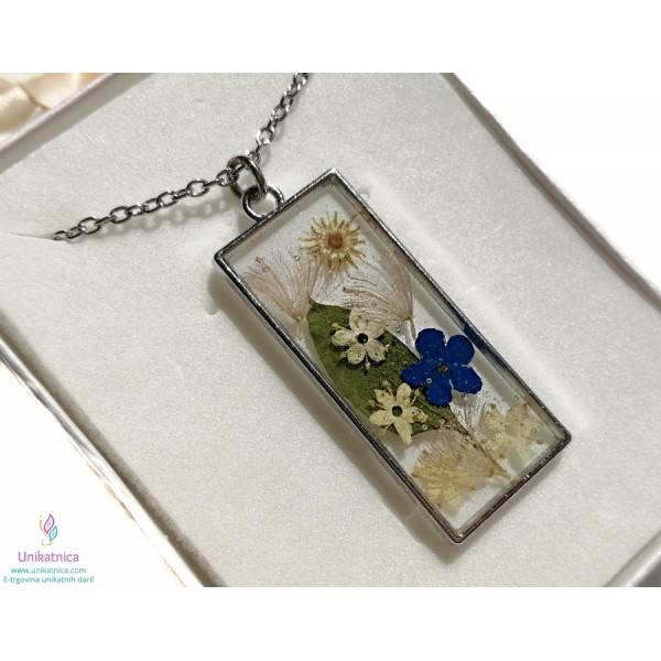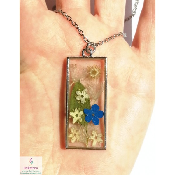 Ročno izdelana cvetlična ogrlica z vdelanimi pravimi cvetovi bezga, travniške spominčice (torilnice) ter sredico enoletne suholetnice, je eleganten in ženstven modni dodatek, ki si ga lahko nadanete ob najrazličnejših priložnostih.