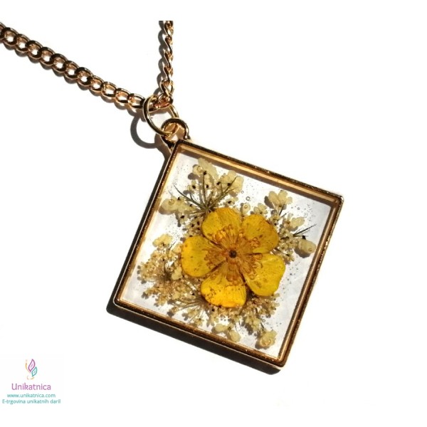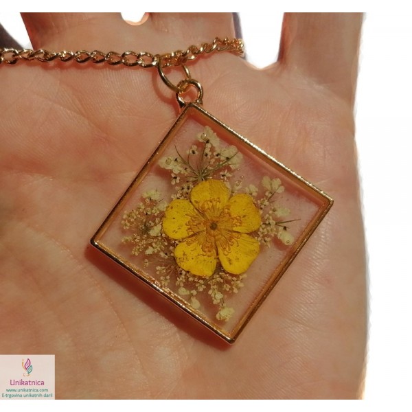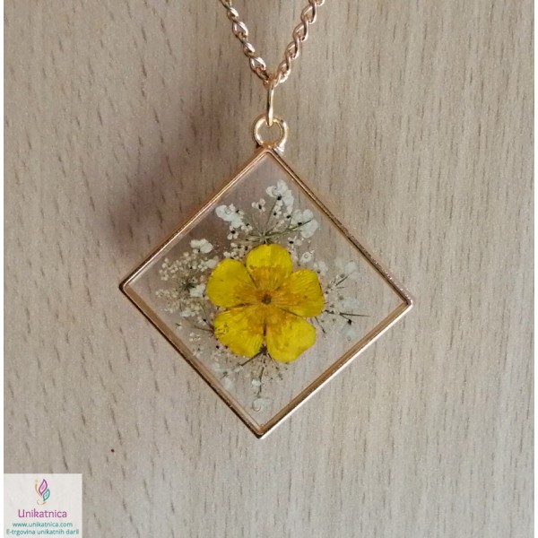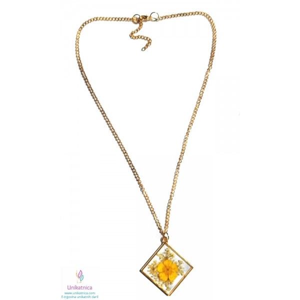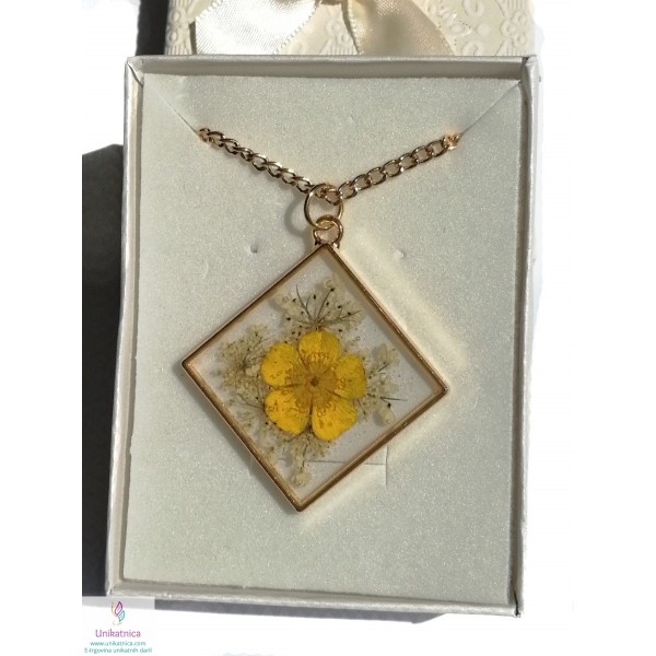 Ročno izdelana cvetlična ogrlica v obliki romba, z vdelano pravo travniško zlatico, je eleganten in ženstven modni dodatek, ki si ga lahko nadanete ob najrazličnejših priložnostih.
