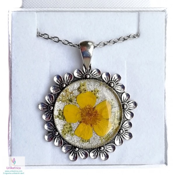 Ročno izdelana cvetlična ogrlica iz ročno nabranih cvetov ripeče travniške zlatice, je eleganten in ženstven modni dodatek, ki si ga lahko nadanete ob najrazličnejših priložnostih. Simbolika travniških zlatic - ljubezen, naklonjenost.