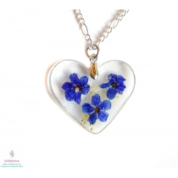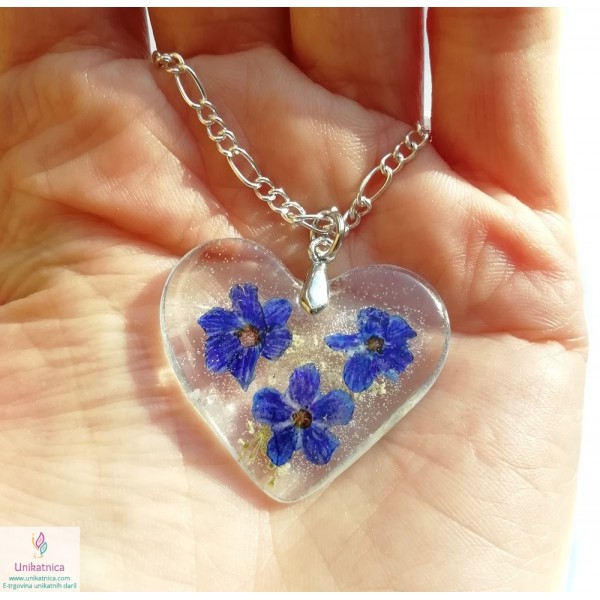 Ročno izdelana cvetlična ogrlica v obliki srca, z vdelanimmi pravimi cvetovi gozdnih spominčic in zravilnega gozdnega korena, je eleganten modni dodatek, ki si ga lahko nadanete ob najrazličnejših priložnostih. Simbolika spominčic: spominjanje, naklonjenost.