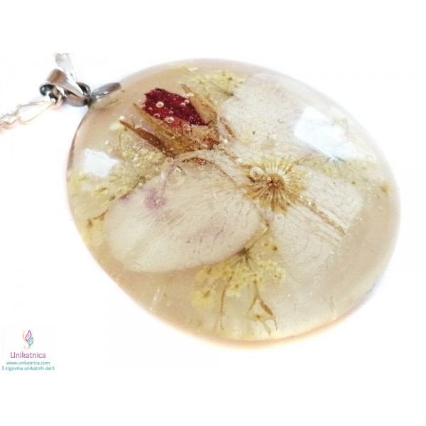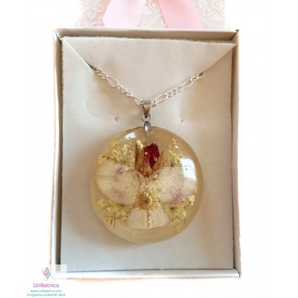 Unikatna, ročno izdelana cvetlična ogrlica, z vdelanimi pravimi cvetovi gozdne spominčice (glavica telesca), domače orhideje (telo in krila angela), srednjega dela enoletne suholetnice (na prsih in v sedini glavice angela) in zdravilnega gozdnega korena (ozadje ogrlice). Skupaj tvorijo motiv angela oz. vilinke, ki ima vzdolž telesca zlato nitko.