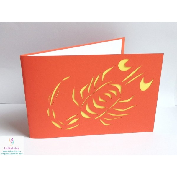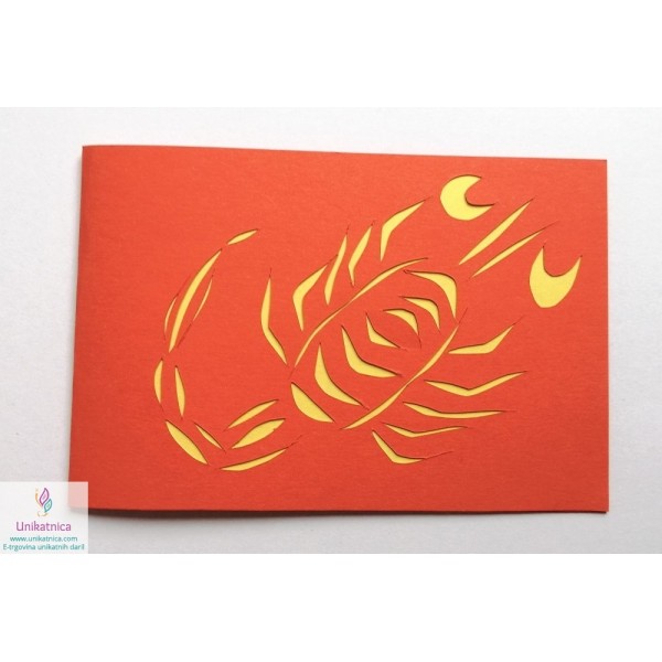 Motiv unikatne, ročno izdelane voščilnice z zodiakalnim znakom Škorpijona je avtorsko delo. Motiv Škorpijona je ročno izrezan iz različnih materialov različnih barv in teksture. V voščilnici se skriva še presenečenje - na notranji levi strani se v vsaki voščilnici nahaja opis horoskop znaka, njegove osnovne značilnosti, ki jih bo obdarovanec z veseljem prebral, tako za žensko, kot tudi za moškega.