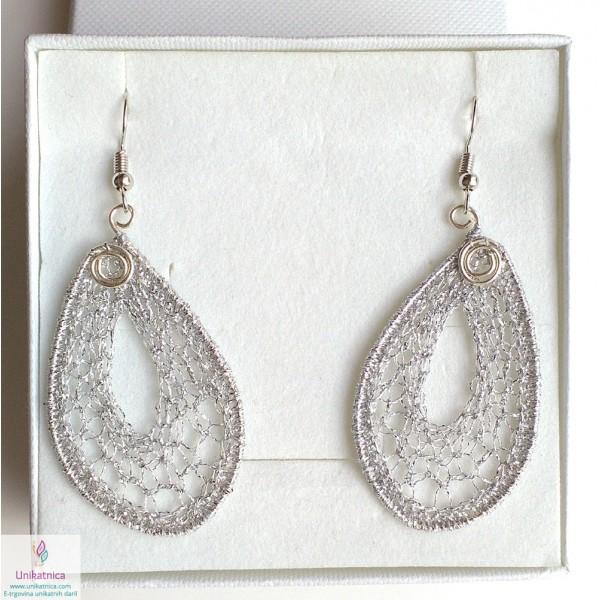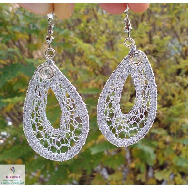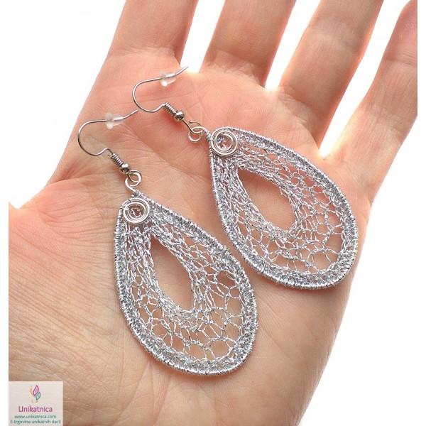 Ročno kvačkani uhani iz posrebrene žice in srebrne prejice, ki jih krasi motiv kapljice, so eleganten, ženstven in zelo opazen nakit, ki se vam bo podal na oblačila v skoraj vseh barvah. So lahki za nošenje, na soncu in pod lučjo pa se bodo močno lesketali.