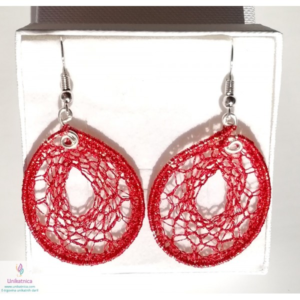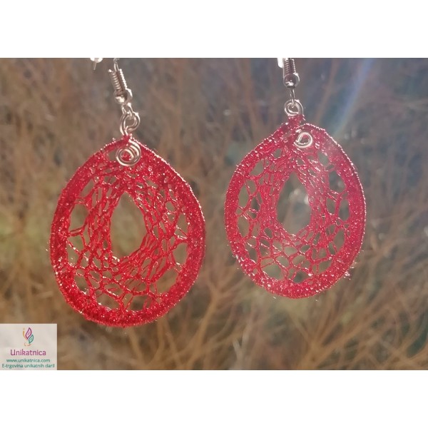 Kvačkani uhani iz posrebrene žice in svetleče rdeče prejice, so izviren in ženstven modni dodatek. Uhane krasi čisto poseben, unikaten vzorček. So izjemno lahki za nošenje, z varnostii silikonskimi čepki na zaponkah in brez nikjla, na sončni svetlobi se lesketajo.