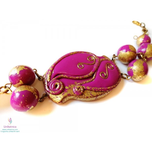 Unikatna, ročno izdelana zapestnica z unikatnim vzorcem iz žice v ciklamni barvi s pozlatitvijo. Vse kroglice so narejene ročno.