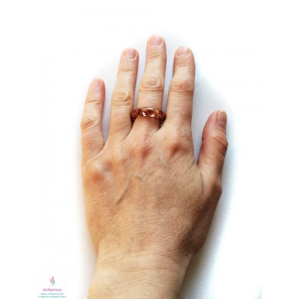 Ročno izdelan cvetlični prstan (rinka) iz celega, s cvetnimi lističi rdeče vrtnice, je eleganten modni dodatek, ki si ga lahko nadanete ob najrazličnejših priložnostih.