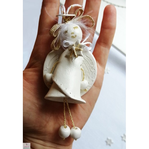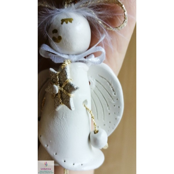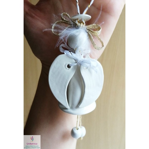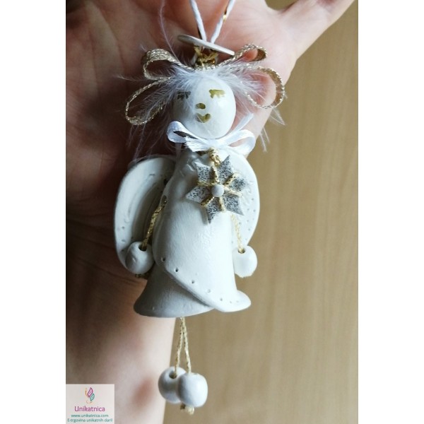 Glineni angelček obesek in DARILO - ena unikatna božično novoletna voščilnica (v srebrnih, svetleče modrih ali svetleče rdečih odtenkih). Glineni angelček predstavlja lepo darilo ob rojstnem dnevu, krstu, birmi, obhajilu ter božično novoletnih praznikih. Glineni angelček obesek je izdelan iz na zraku sušeče se gline, zaščiten je z vodoodpornim lakom. Dodani so laski iz perja, ročno izdelane in prevezane zvezdice ter ročno izdelane mašnice z vrvico.