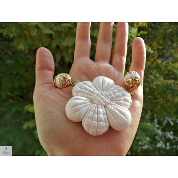 Unikatna ogrlica v obliki rože iz kolekcije Esenca belega cveta je ročno izdelan kos nakita, ki ga navdaja vonj kipečega cveta. Nakit se poda na vintage-elegantna oblačila.