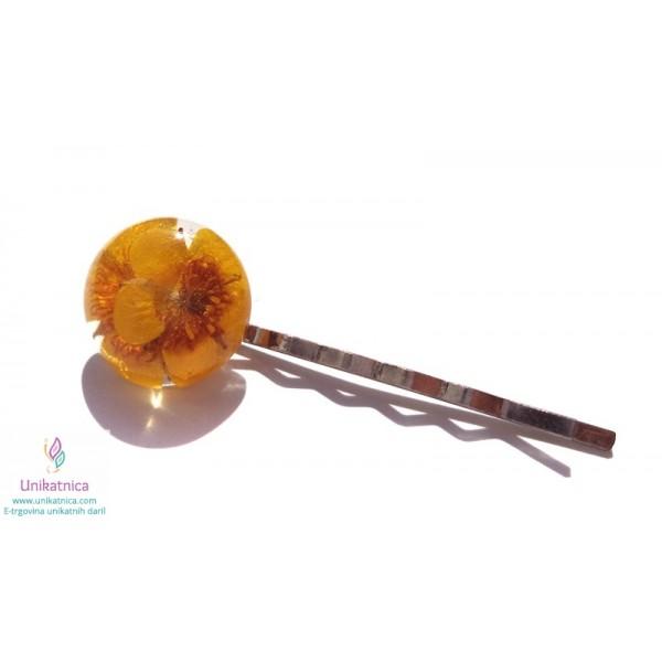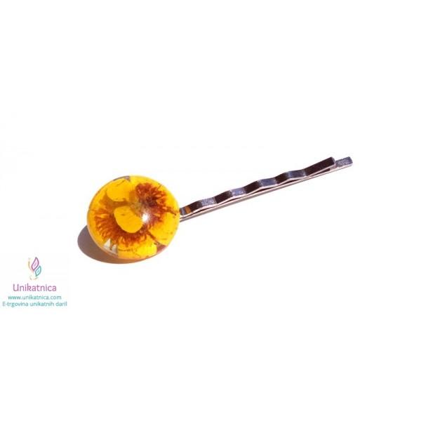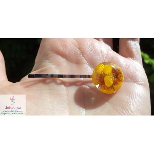 Ročno izdelana cvetlična sponka za lase (špangica za lase), v katero sem vdelala cvet prave tranviške zlatice, je ličen modni dodatek, ki si ga lahko nadanete ob najrazličnejših priložnostih.