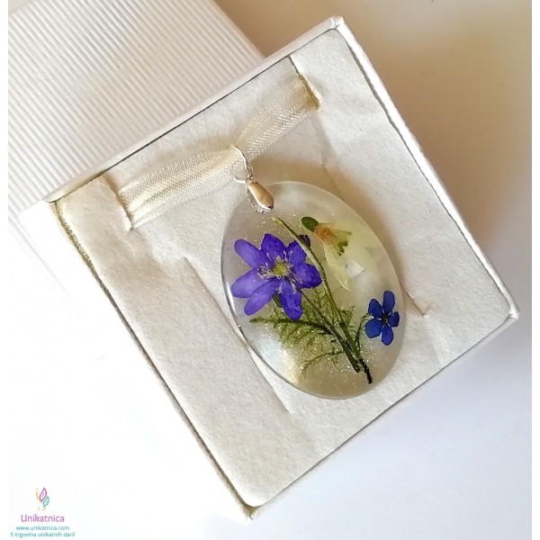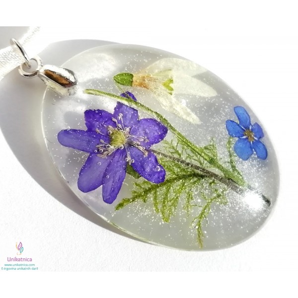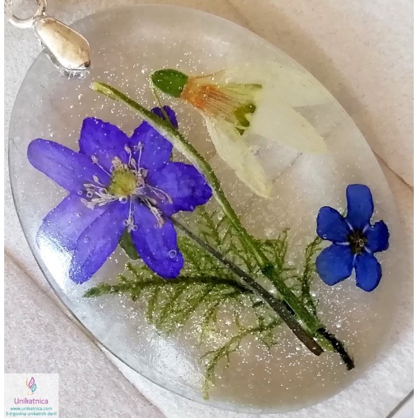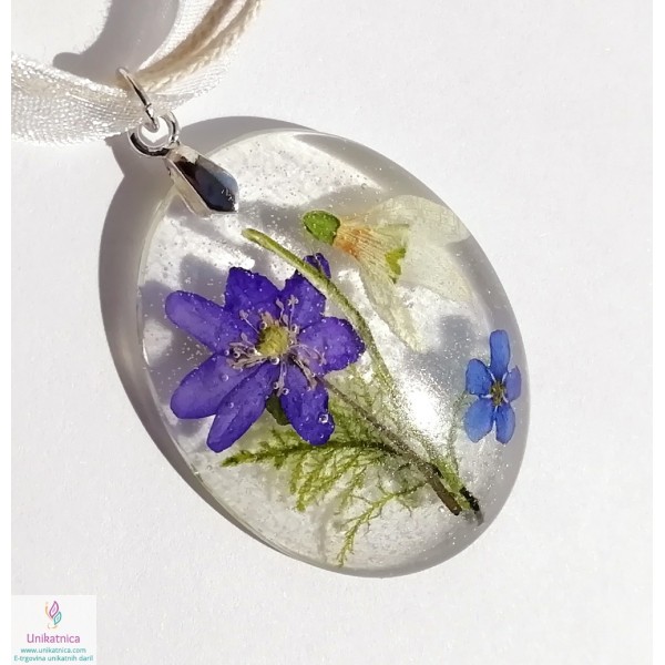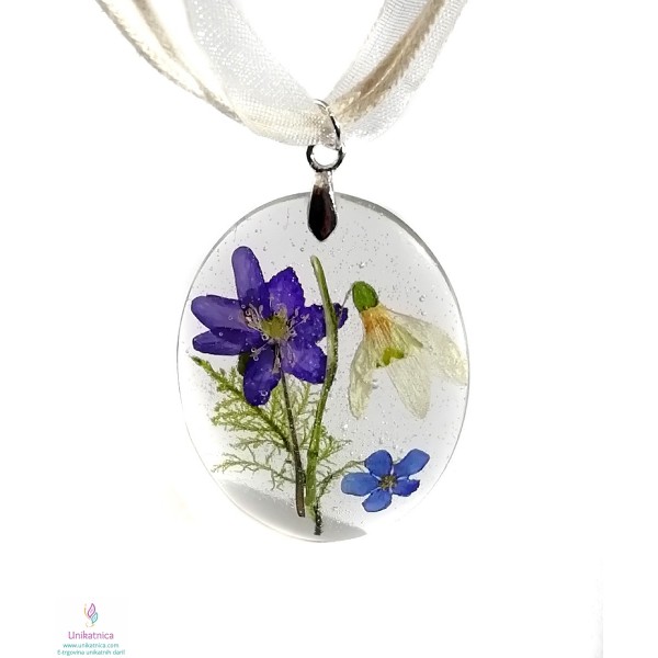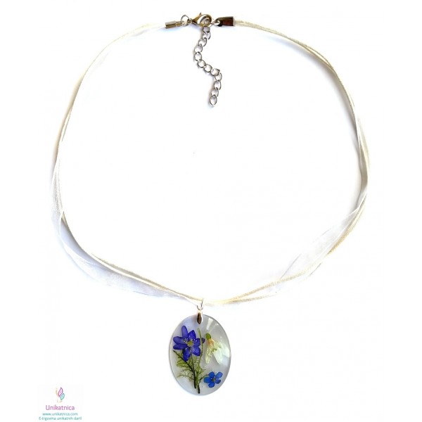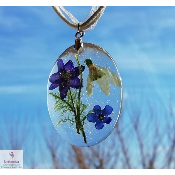 Ročno izdelana cvetlična ogrlica iz ročno nabranih cvetov pomladanske torilnice (gozdne spominčice), jetrnika, navadnega malega zvončka ter gozdnega maha, je eleganten in ženstven modni dodatek, ki si ga lahko nadanete ob najrazličnejših priložnostih.