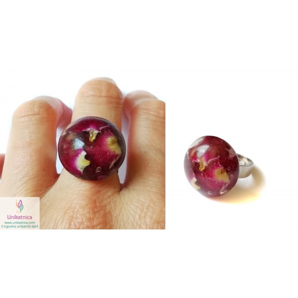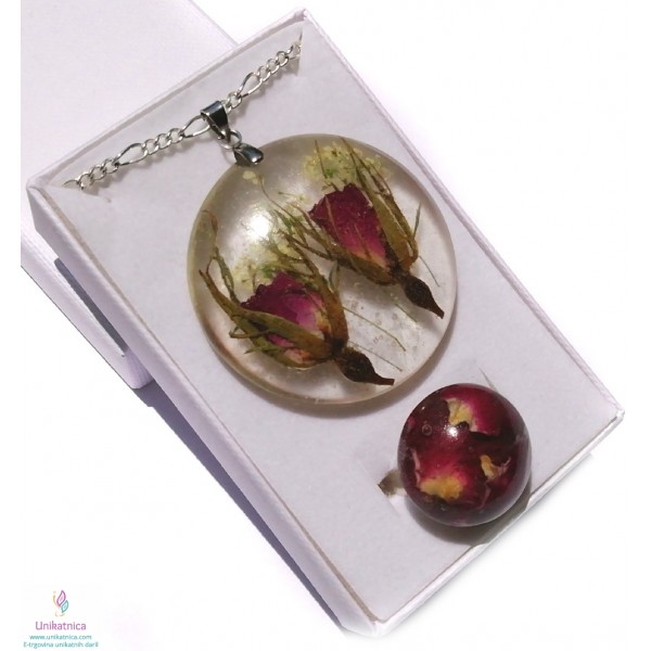 Ročno izdelana ogrlica in prstan s pravima popkoma in cvetnimi lističi divje vrtnice. Nakit spremlja opis s smboliko izbranega cvetja.