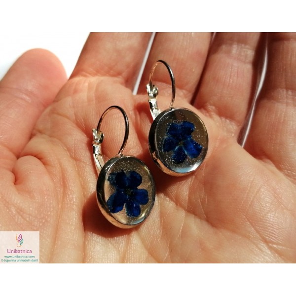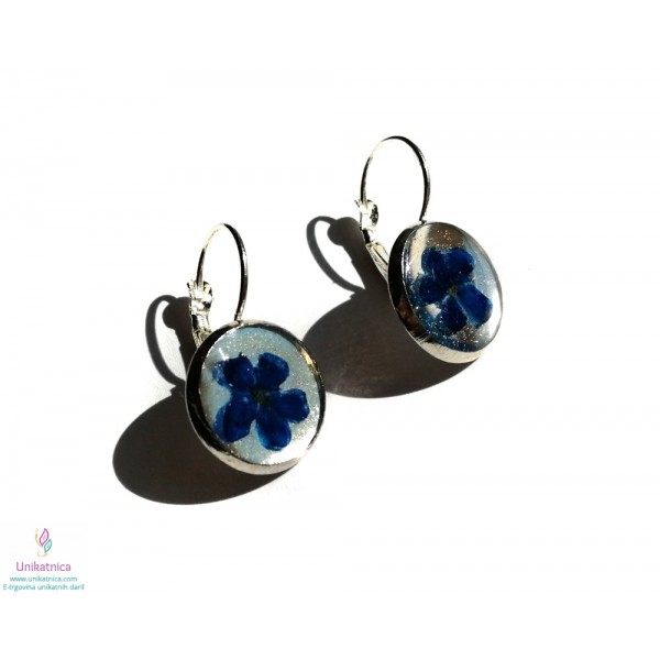Cvetlična zapestnica in DARILO (uhani) z ogrrodjem in v smolo zalitim cvetjem: cvetovi jetrnika, gozdne spominčice in gozdnega maha.