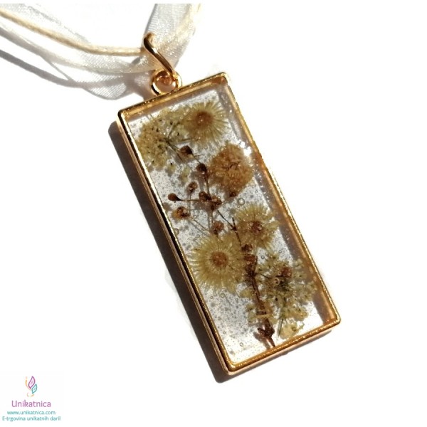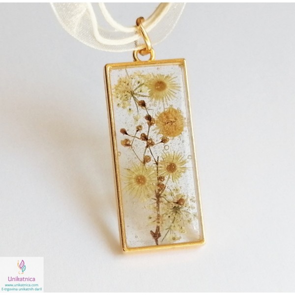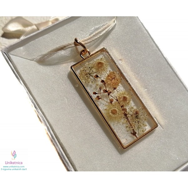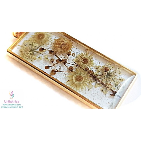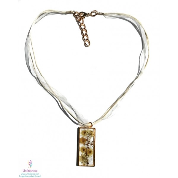 Ročno izdelana cvetlična ogrlica z vdelanimi pravimi cvetovi navadne travniške lakote in sredico enoletne suholetnice, je eleganten in ženstven modni dodatek, ki si ga lahko nadanete ob najrazličnejših priložnostih.