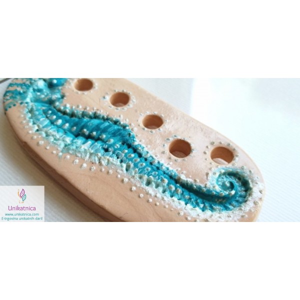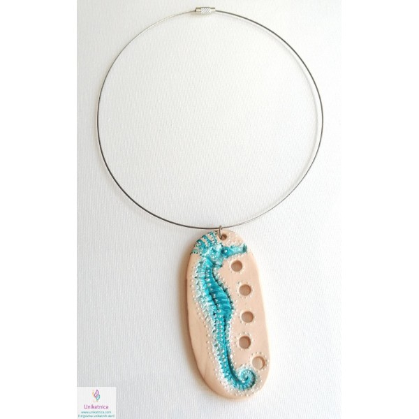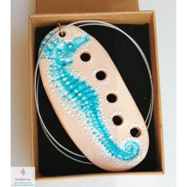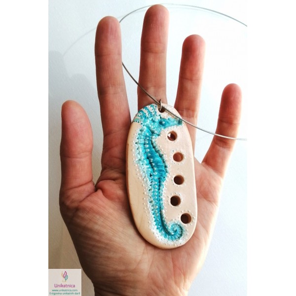 Poletje piše prav posebno zgodbo. Tokrat jo je zapisalo v glino, kjer je pustilo pečat morskega konjička, ki spominja na morje, peščene plaže, romantične zgodbe in na občutek sproščenosti. Ogrlica z reliefnim motivom morskega konjička, ki je ročno poslikan, je uporabno, zelo lepo, unikatno, izvirno in domiselno darilo za ženske, ki imajo rade čisto poseben, opazen in drugačen unikatni nakit za ženske. Nakit iz gline se bo čudovito podal na lahna poletna in druga oblačila v odtenkih peščenih, pastelnih ter drugih barv, še posebej na odtenke turkizne, modre, rumene, ciklamne, vijolične in bele. Glineni nakit z motivom morskega konjička v turkiznih odtenkih krasi usnjena vrvica kožne barve, ki se bo lepo zlila s poltjo ženske, ki jo bo nosila. Ogrlica z motivom morskega konjička je zaščitena s posebnim premazom, ki obesek varuje pred poškodbami.