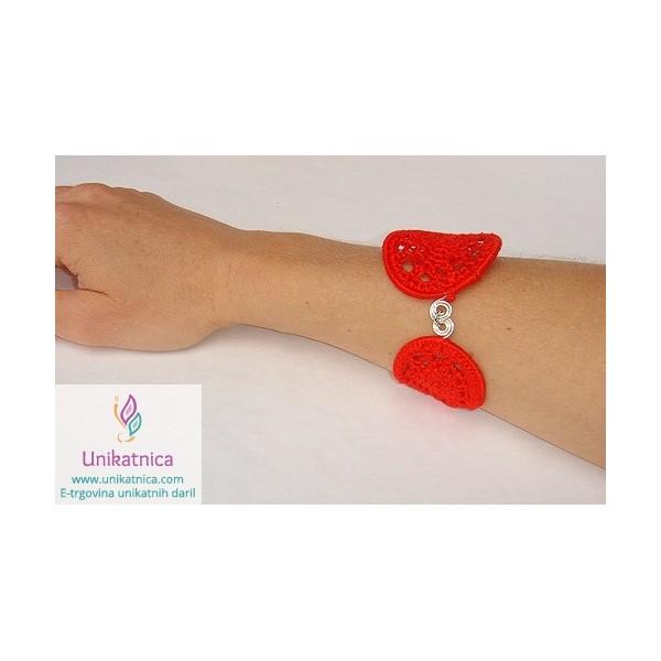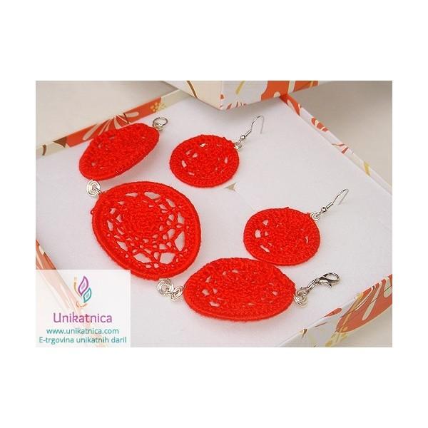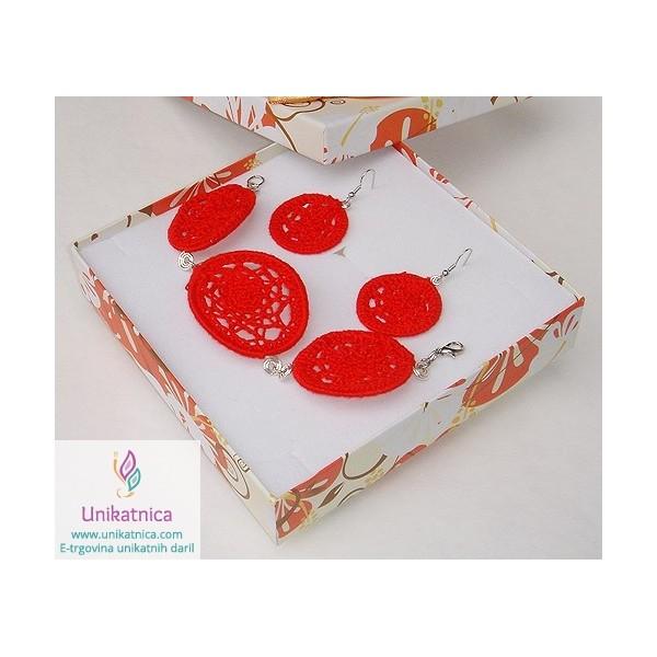 Ta čudovit, ročno kvačkan nakit v ognjeno rdeči barvi, je narejen iz rdeče prejice ter žice, namenjen je ženskam, ki imajo rade prav posebne, unikatne, izvirne ter uporabne modne dodatke, s pridihom brezčasnosti. Ta unikatni, kvačkan nakit v rdeči barvi (kvačkana zapestnica in uhani), so čudovito unikatno darilo tudi ob čisto posebnih priložnostih, kot so rojstni dnevi ter drugi pomembni dogodki. Podarite ga lahko tudi kot izvirno poslovno darilo, saj je slovenskega porekla.