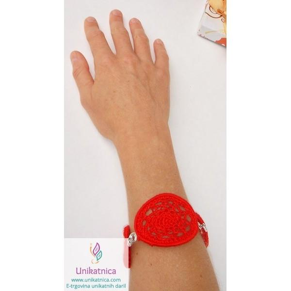 Zapenjanje kvačkane zapestnice: kvačkana zapestnica v rdeči barvi se zapenja s posrebreno zaponko v obliki "rakovih klešč" ali pa s posrebreno jing-jang zaponko (ob naročilu navedite željeni način zapenjanja). podaljšate jo lahko s priloženimi dodatnimi netki.