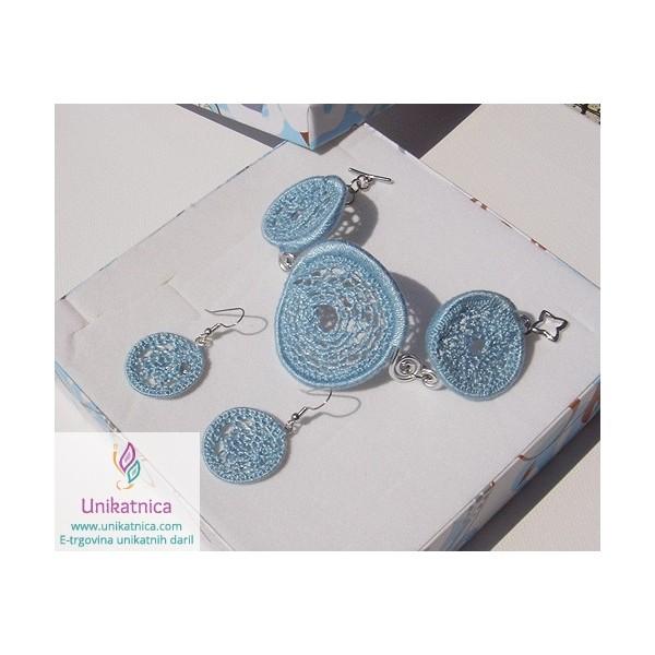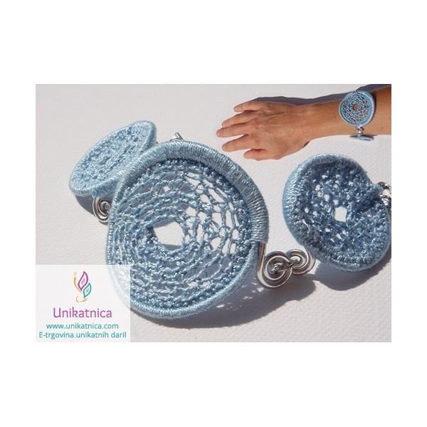 Ta čudovit, ročno kvačkan nakit v nebesno modri barvi, je zelo ženstven, oapzen, izviren, unikaten in nadvse posrečen modni dodatek, ki ga lahko nosite kot čudoivto popestritev številnih oblačil in modnih dodatkov, ki so narejeni v športno elegantnem slogu. Nebesno modri kvačkan nakit je narejen iz modre prejice ter žice, namenjen je ženskam, ki imajo rade čisto posebne, izvirne, uporabne in unikatne modne dodatke. Ta unikatni, kvačkan nakit v nebesno modri barvi (kvačkana zapestnica in uhani), so čudovito unikatno darilo tudi ob prav posebnih priložnostih, kot so rojstni dnevi in drugi pomembni dogodki. Podarite ga lahko tudi kot lepo poslovno darilo, ki je izvirno in slovenskega porekla. Nakit je izjemno prijeten na otip in povsem lahek za nošenje.