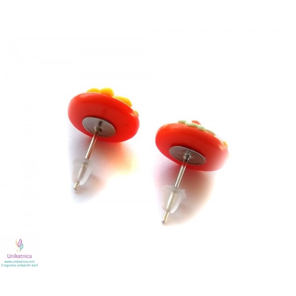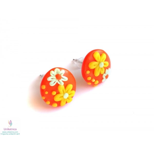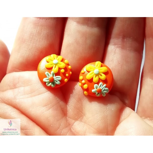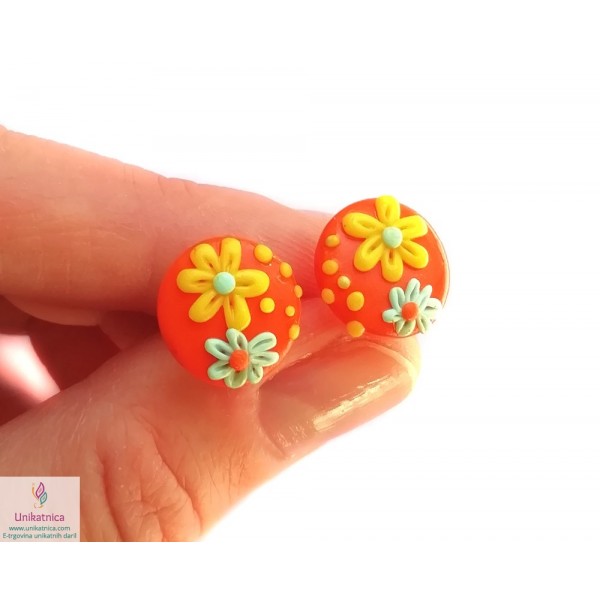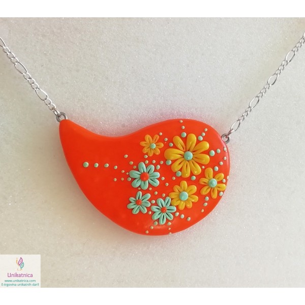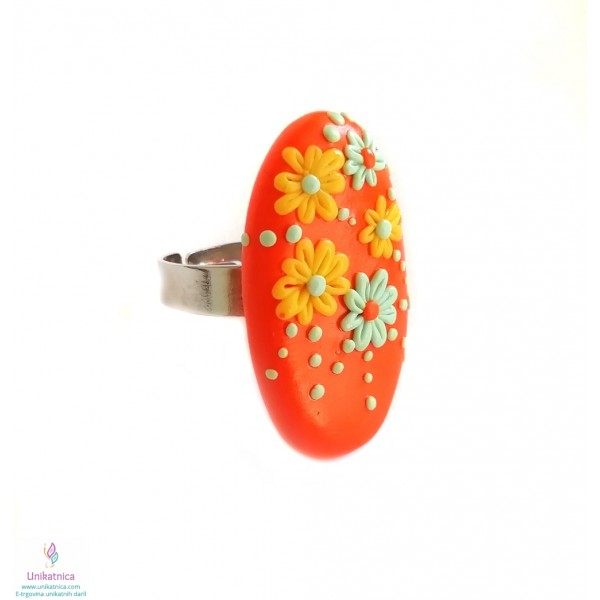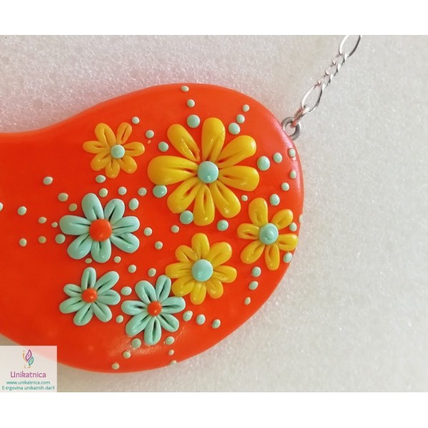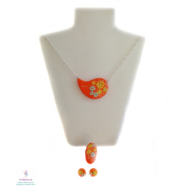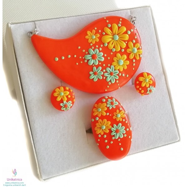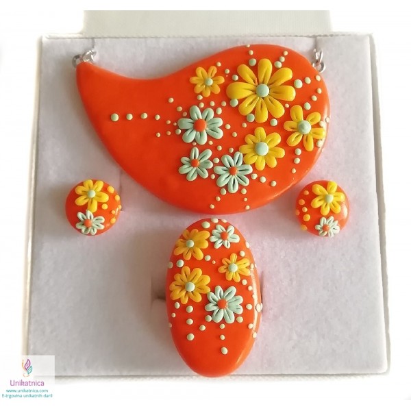 Ročno izdelani uhani, prstan in ogrlica v oranžni barvi, so iz kolekcije nakita za ženske z imenom Pomlad. Izdelke krasijo ročno izdelani vzorčki drobnih rožic, marjetic, ki bodo pridali pridih ženstvenosti, čutnosti in čarobnosti svežine pomladi. Unikatni nakit za ženske iz kolekcije Pomlad predstavlja lepo darilo za ženske in deklice ob najrazličnejših priložnostih. Vsak delček nakita je izdelan zgolj z rokami, brez modelčkov in predstavlja avtorski unikat. Unikatni nakit je narejen iz polimerne mase, z dodanimi naravnimi sestavinami ter iz koži prijaznih materialov, ki ne vsebujejo niklja, zato so primerni tudi za alergike.