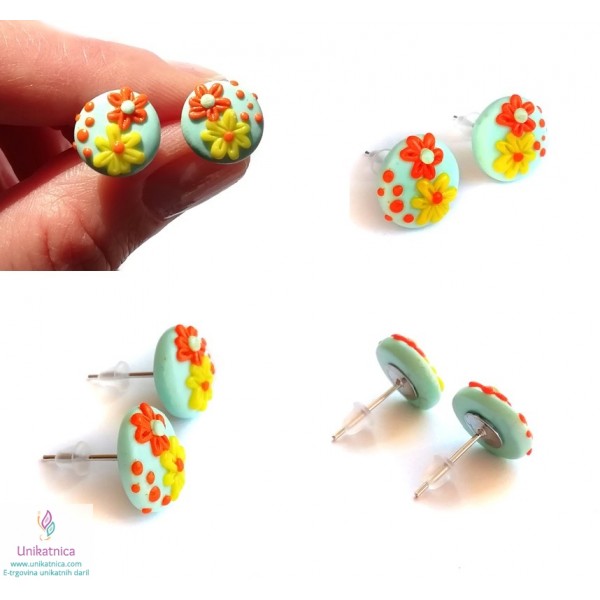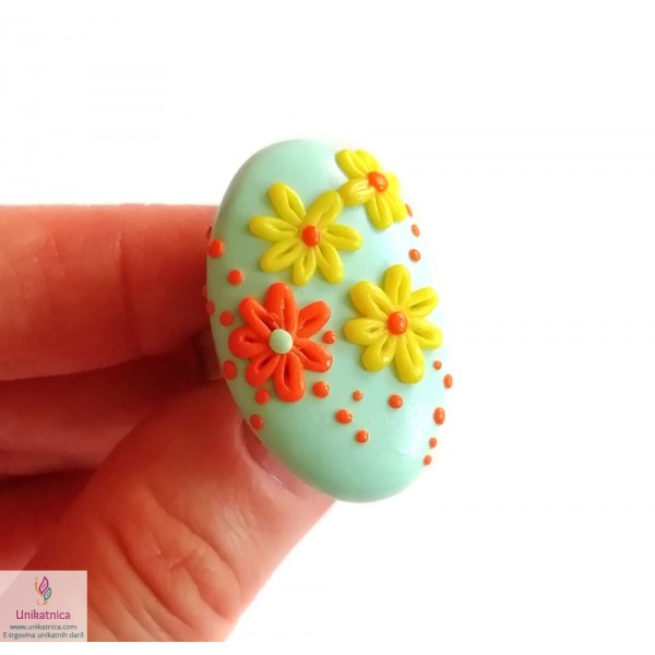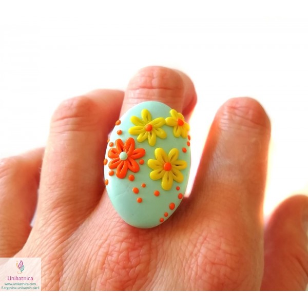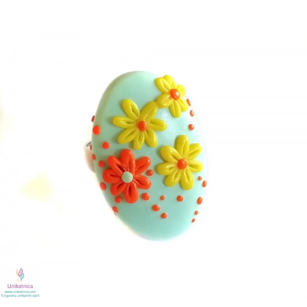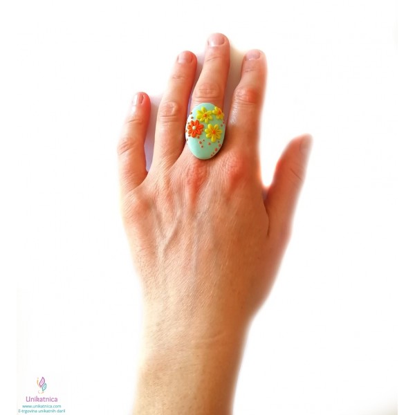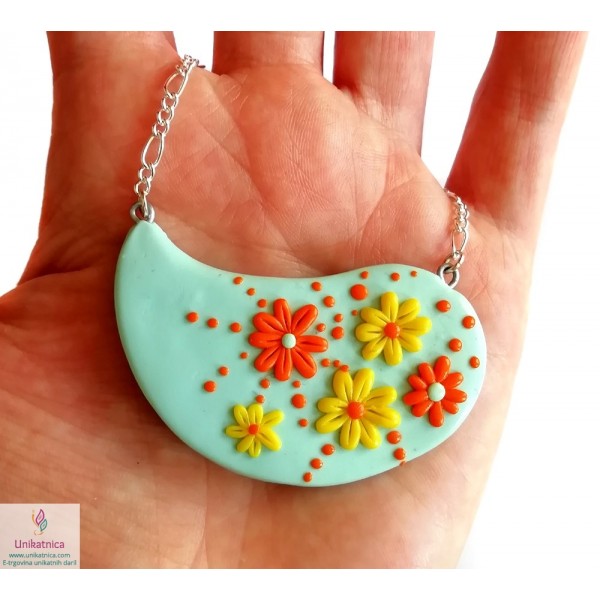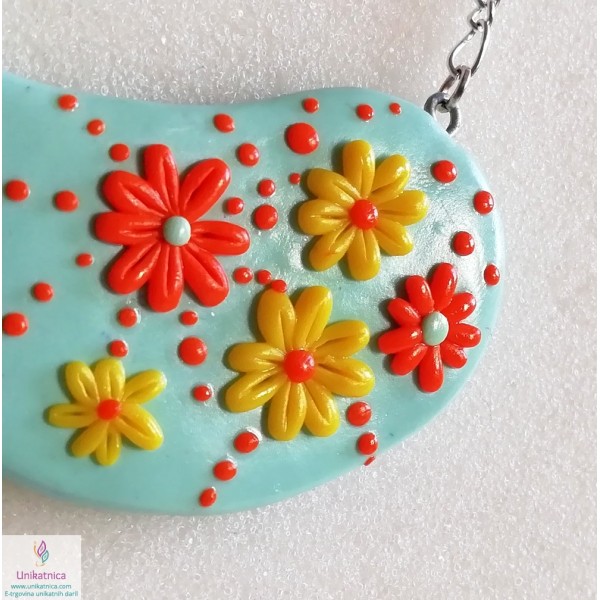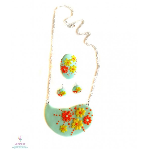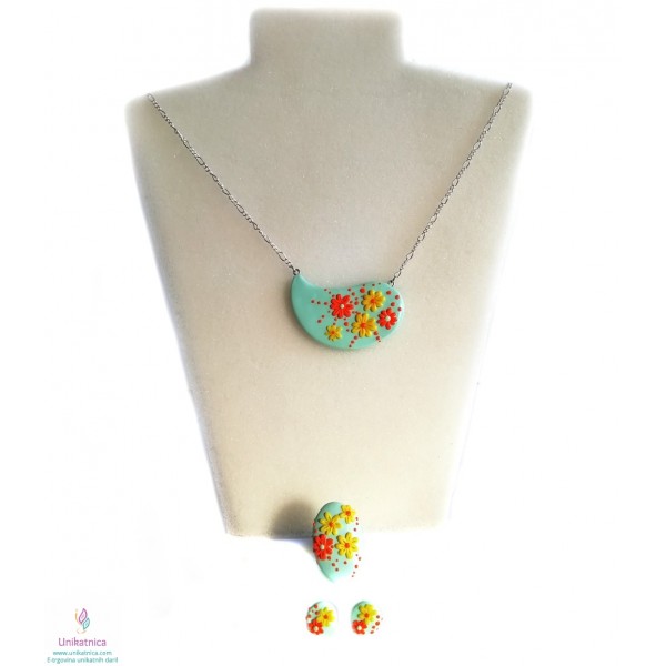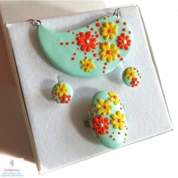 Ročno izdelani uhani, prstan in ogrlica v turkizni barvi, so iz kolekcije nakita za ženske z imenom Pomlad. Izdelke krasijo ročno izdelani vzorčki drobnih rožic, marjetic, ki bodo pridali pridih ženstvenosti, čutnosti in čarobnosti svežine pomladi. Unikatni nakit za ženske iz kolekcije Pomlad predstavlja lepo darilo za ženske in deklice ob najrazličnejših priložnostih. Vsak delček nakita je izdelan zgolj z rokami, brez modelčkov in predstavlja avtorski unikat. Unikatni nakit je narejen iz polimerne mase, z dodanimi naravnimi sestavinami ter iz koži prijaznih materialov, ki ne vsebujejo niklja, zato so primerni tudi za alergike.