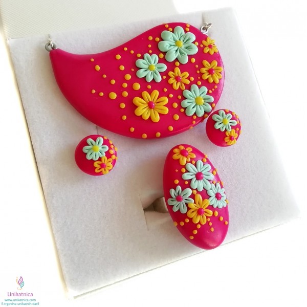 Ročno izdelani uhani, prstan in ogrlica v ciklamni barvi, so iz kolekcije nakita za ženske z imenom Pomlad. Izdelke krasijo ročno izdelani vzorčki drobnih rožic, marjetic, ki bodo pridali pridih ženstvenosti, čutnosti in čarobnosti svežine pomladi. Unikatni nakit za ženske iz kolekcije Pomlad predstavlja lepo darilo za ženske in deklice ob najrazličnejših priložnostih. Vsak delček nakita je izdelan zgolj z rokami, brez modelčkov in predstavlja avtorski unikat. Unikatni nakit je narejen iz polimerne mase, z dodanimi naravnimi sestavinami ter iz koži prijaznih materialov, ki ne vsebujejo niklja, zato so primerni tudi za alergike.