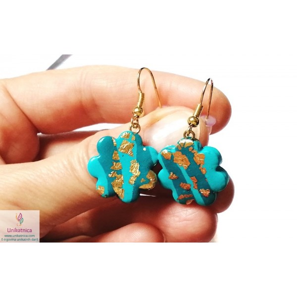 Viseči uhani za ženske v turkiznih odtenkih, z dodatkom zlatitvenih lističev, so namenjeni ženskam, ki iščejo simpatične, preproste in razigrane modne dodatke. Turkizna in zlata barva bosta poživili vašo garderobo.