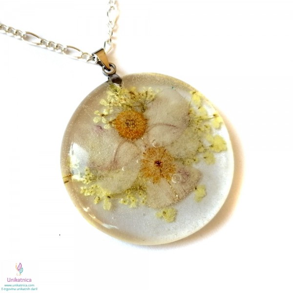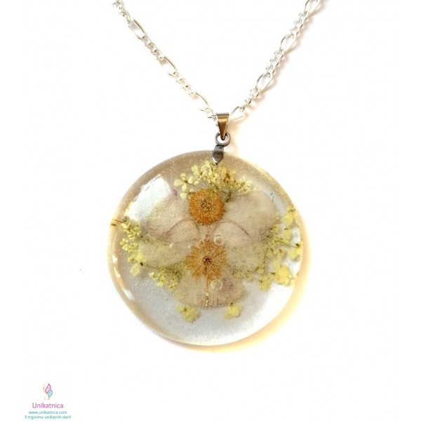 Unikatna, ročno izdelana cvetlična ogrlica, z vdelanimi pravimi cvetovi enoletne suholetnice (glavica in srce angela), domače orhideje (telo in krila angela) in zdravilnega gozdnega korena (ozadje ogrlice). Skupaj tvorijo motiv angela oz. vilinke, ki ima vzdolž telesca srebrno nitko.