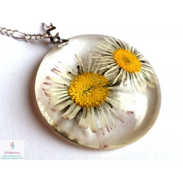 Ročno izdelana cvetlična ogrlica z vdelanim pravim cvetom travniške marjetice ter DARILO - prstan s travniško marjetico, je eleganten in ženstven modni dodatek, ki si ga lahko nadanete ob najrazličnejših priložnostih.