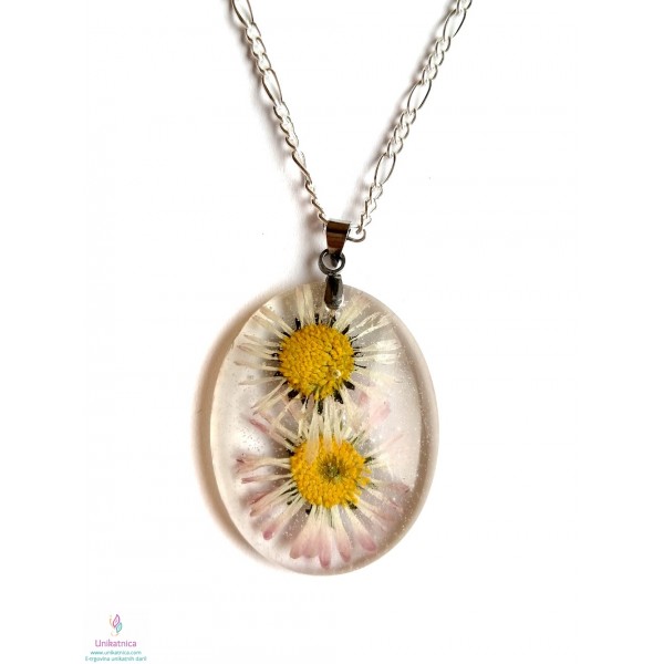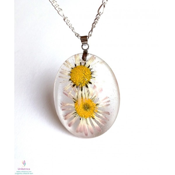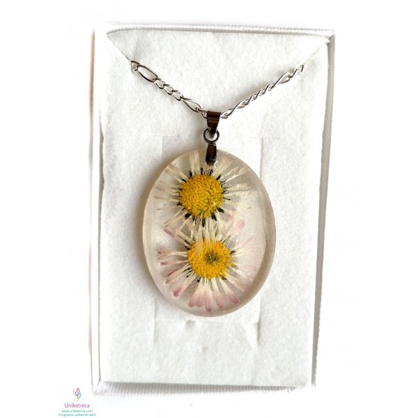 Ročno izdelana cvetlična ogrlica z vdelanima pravima cvetoma travniške marjetice, je eleganten in ženstven modni dodatek, ki si ga lahko nadanete ob najrazličnejših priložnostih.