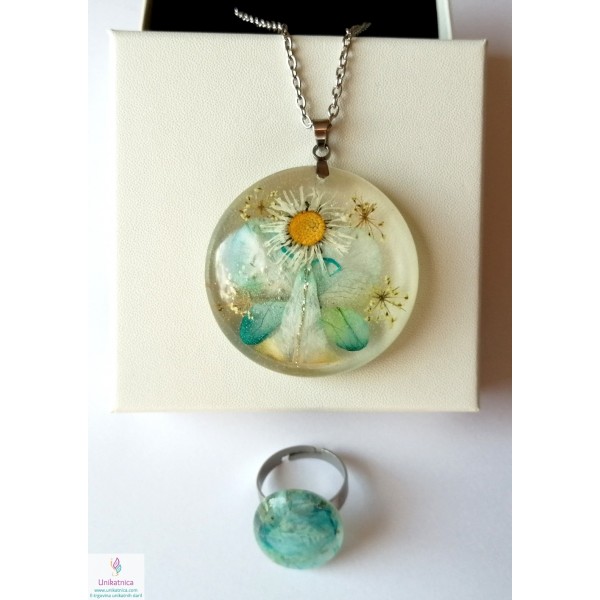 Unikatna, ročno izdelana cvetlična ogrlica in DARILO (prstan), z vdelanimi pravimi cvetovi marjetice (glavica angela), domače orhideje (telo in krila angela ter prstan) in zdravilnega gozdnega korena (ozadje ogrlice). Skupaj tvorijo motiv angela oz. vilinke.
