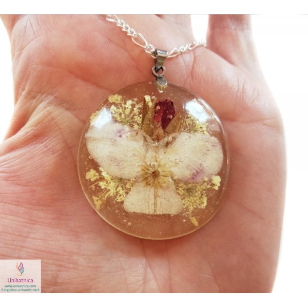 Cvetlični angeli in vile so kolekcija ročno izdelanega cvetličnega nakita, narejenega iz pravega cvetja (travniškega, gozdnega in vrtnega) in smole. Izdelala sem jih v obdobjih polne lune v različnih mesecih, tako so prepojeni z energijo mogočne, ženstvene lune, ki napaja žensko s čutnostjo in ženstvenostjo, krati pa je cvetje prepojeno s sončnimi žarki, ki jim je med izdelavo vlivalo moči in življenje. Luna in Sonce imata močno simboliko, njuni energiji pa se pretakata tudi v tej cvetlični, angelsko vilinski ogrlici, v katero sem poleg cvetja vdelala tudi zlato nitko. Zlato simbolizira Sonce, toploto, obilje in aktivno energijo. Orhideja je simbol obilja, iz nje sem naredila krila in telo cvetličnega angela - ta v pravem pomenu besede ponazarja obilje. Kaj pripoveduje, sporoča cvetlični angel oz. vila? To bo izvedela ženska, ki bo nosila izbrano ogrlico, saj k vsakemu izdelku, ki ga zapakiram v lično darilno škatlico, priložim še list z zgodbo o nastanku cvetličnih angelov in vilink ter opisom in simboliko posameznega cvetja. Takšna ogrlica je čudovito praznično darilo ob različnih priložnosti, tudi ob osebnem prazniku.