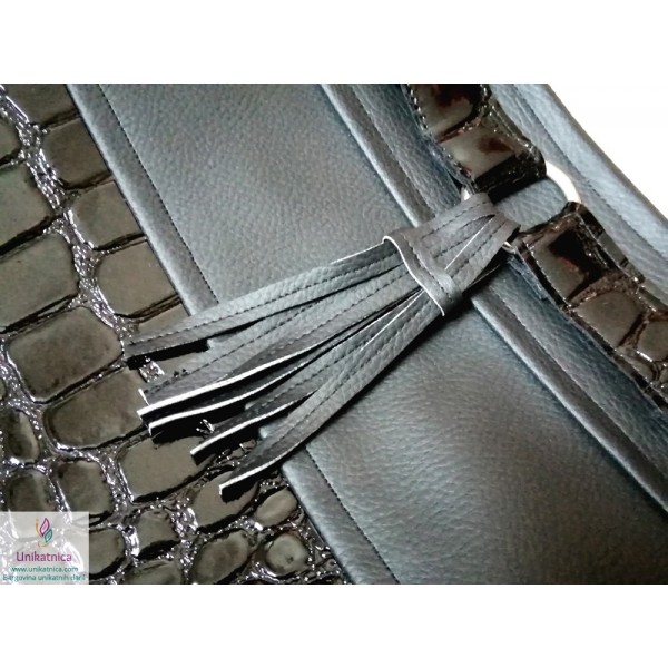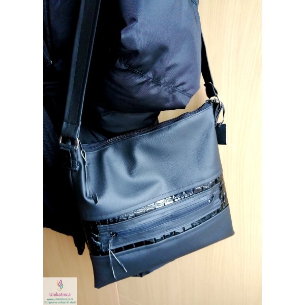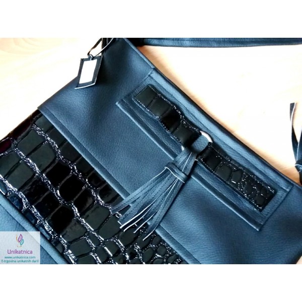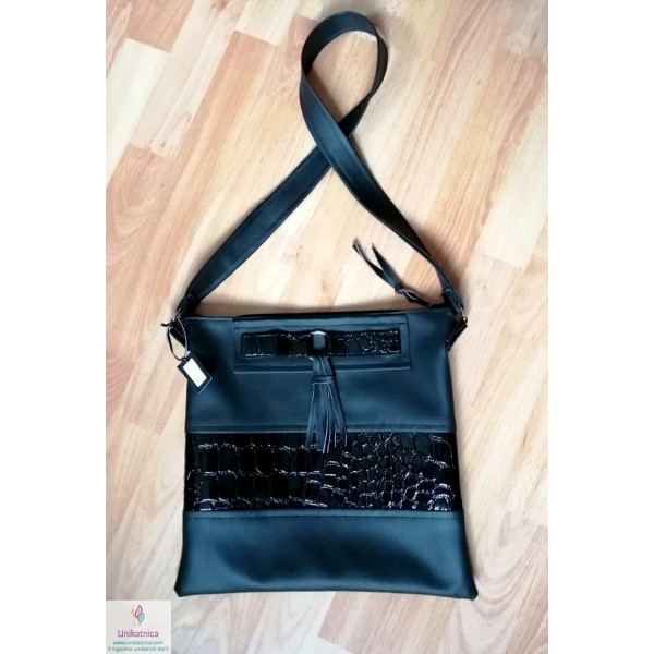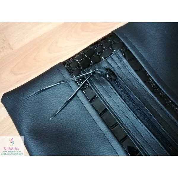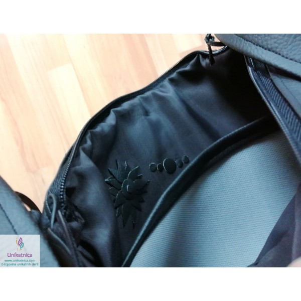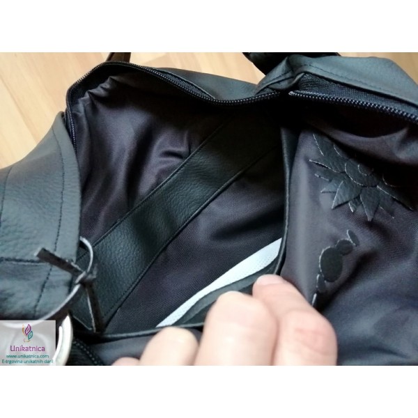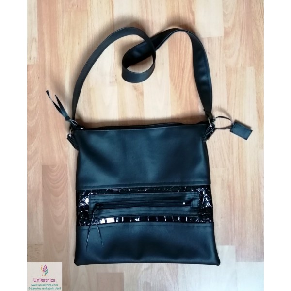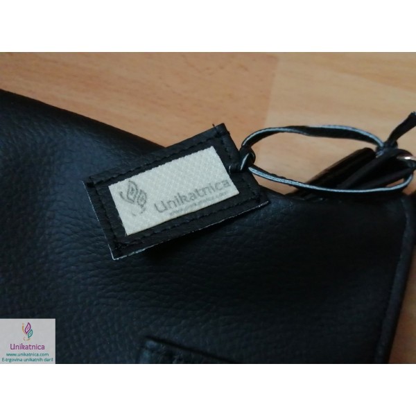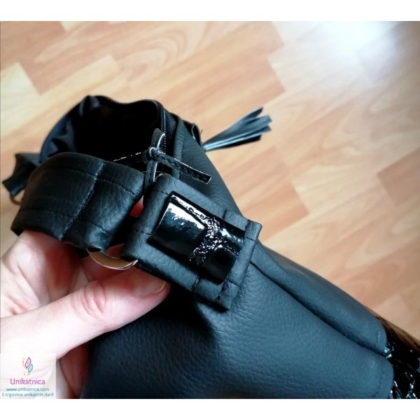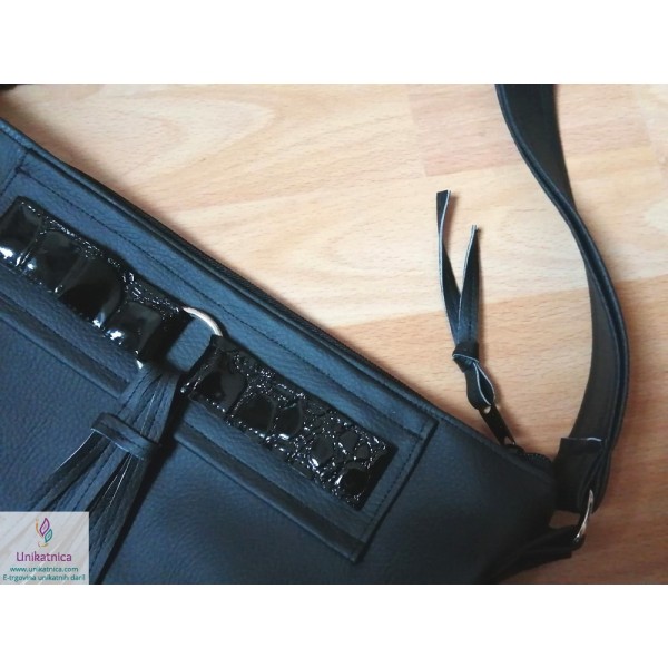 Ženska torba NOirA v črni barvi. Torba za ženske je narejena iz umetnega usnja in recikliranega sukanca, krasijo jo številni unikatni vzorci in okraski. Ima notranji ter zunanji žep.