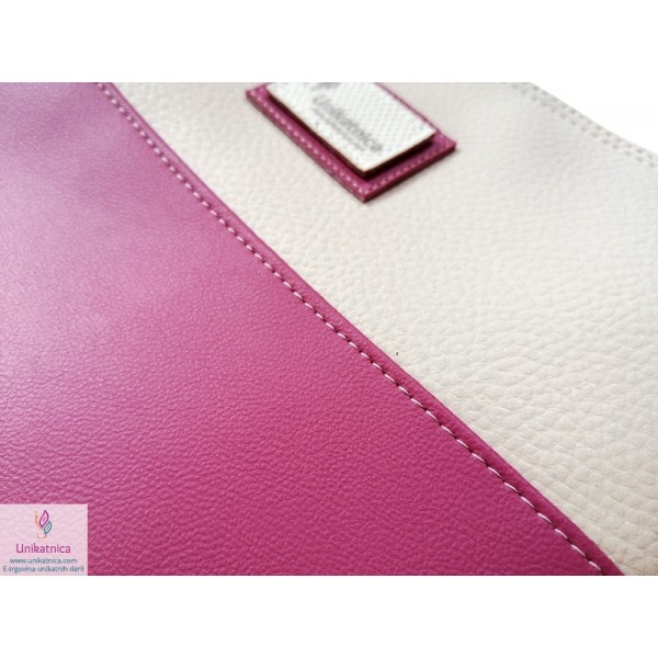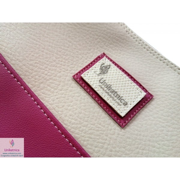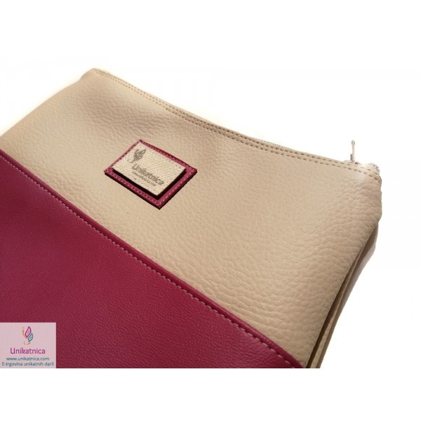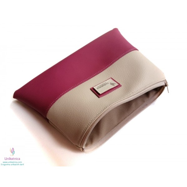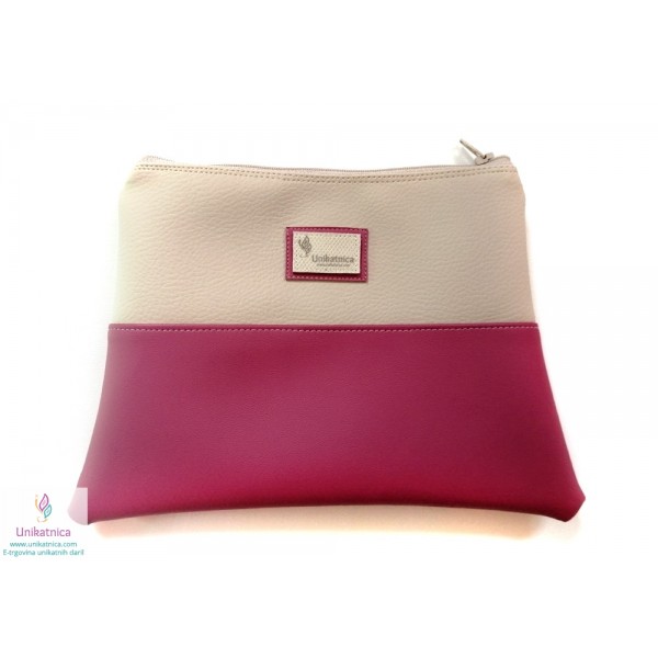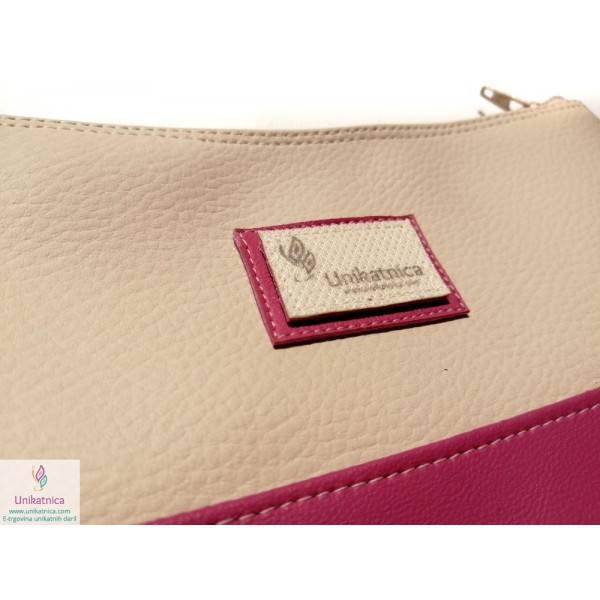 Ženska toaletna torba v malina in vanilija barvi, z zadrgo in podlogo. Toaletna torba je narejena iz umetnega usnja in recikliranega sukanca.