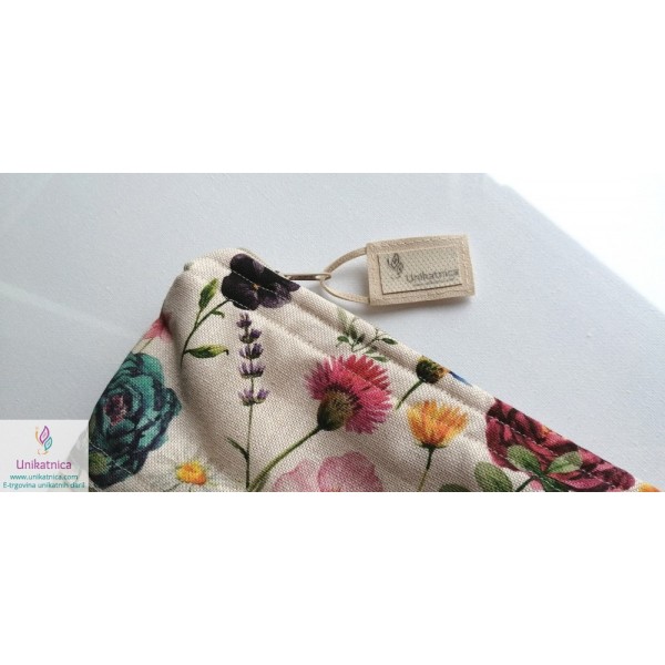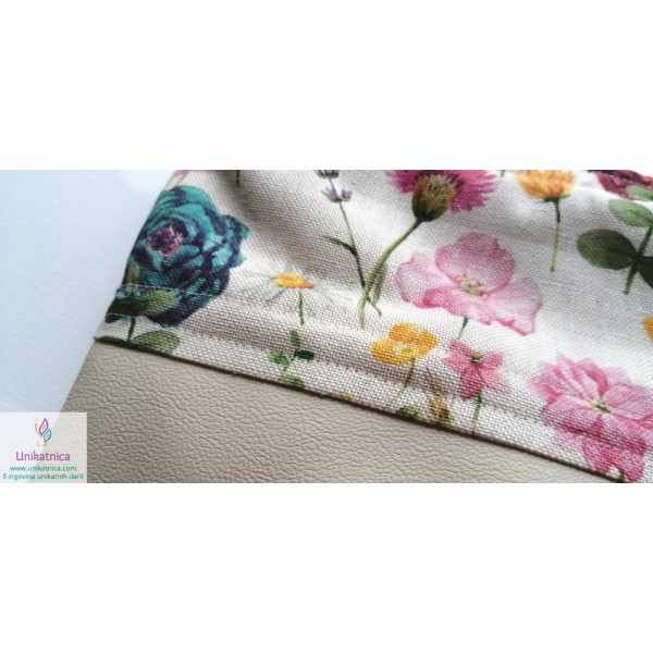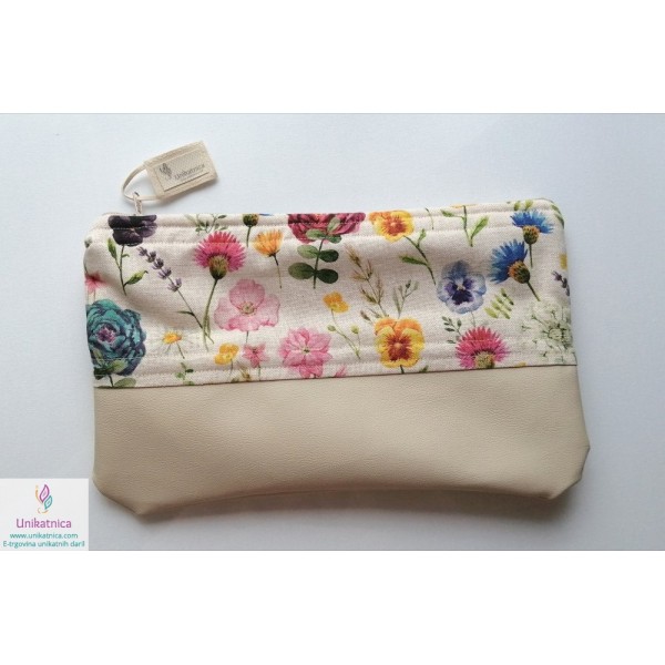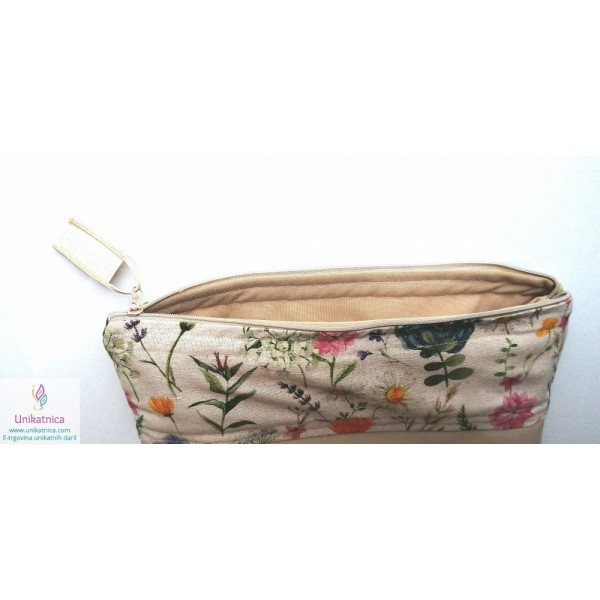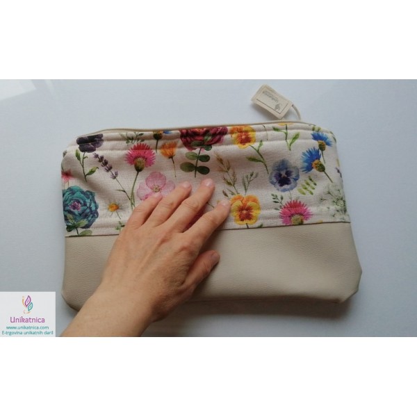 Ženska toaletna torba z motivom cvetja in vanilija barvi, z zadrgo in podlogo. Toaletna torba je narejena iz umetnega usnja in recikliranega sukanca.