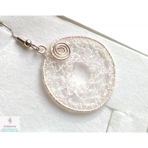 Ročno kvačkani uhani iz posrebrene žice in svetleče bele prejice, ki jih krasi motiv kroga in spirale, so eleganten, ženstven in zelo opazen nakit, ki se vam bo podal na oblačila v skoraj vseh barvah. So lahki za nošenje, na soncu in pod lučjo pa se bodo močno lesketali.