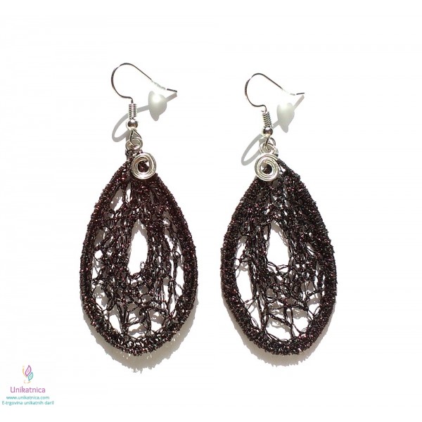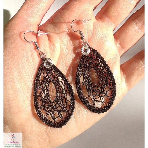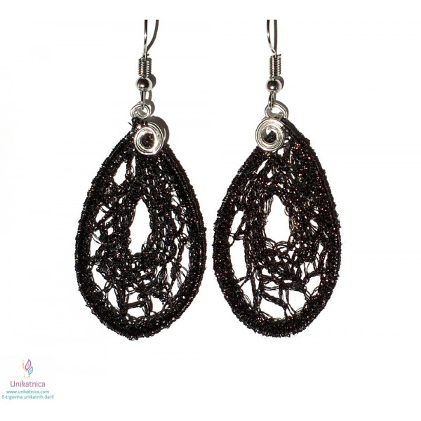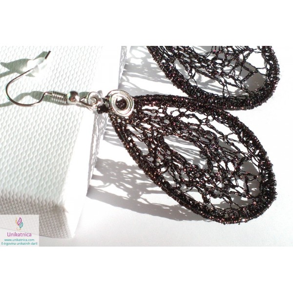 Ročno kvačkani uhani iz posrebrene žice in svetleče črne prejice, ki jih krasi motiv kapljice, so eleganten, ženstven in zelo opazen nakit, ki se vam bo podal na oblačila v skoraj vseh barvah. So lahki za nošenje, na soncu in pod lučjo pa se bodo močno lesketali.