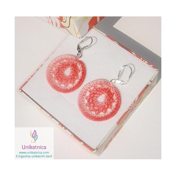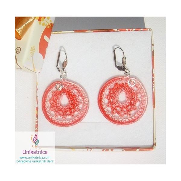 Ročno kvačkani uhani v barvi breskve so narejeni iz prejice in se lepo se podajo ženskam, ki iščejo prav poseben in čudovit modni dodatek. Vzorec iz prejice je unikaten, na vsaki strani drugačen, zato jih lahko nosite na obeh straneh.